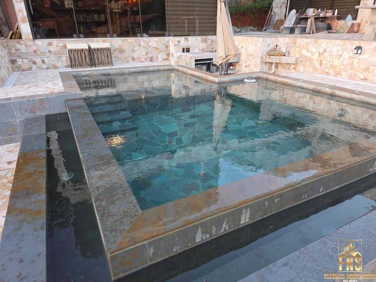 • Piscina com borda infinita e 5 pontos de hidromassagem, revestida com pedra São Tomé Verde e ardósia ferrugem.