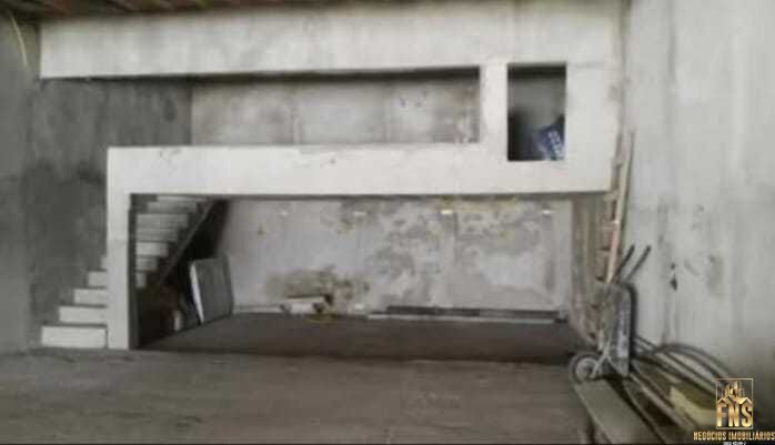 Salão com 7m de frente e 18m de fundos, pé direito com 4,80m, dois banheiros e mezanino, imóvel em ponto de acabamento está com as paredes rebocadas e contra piso pronto.